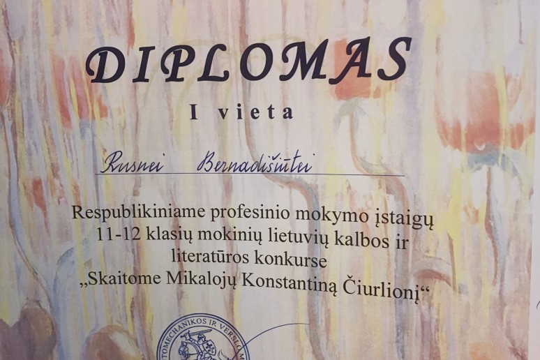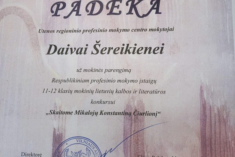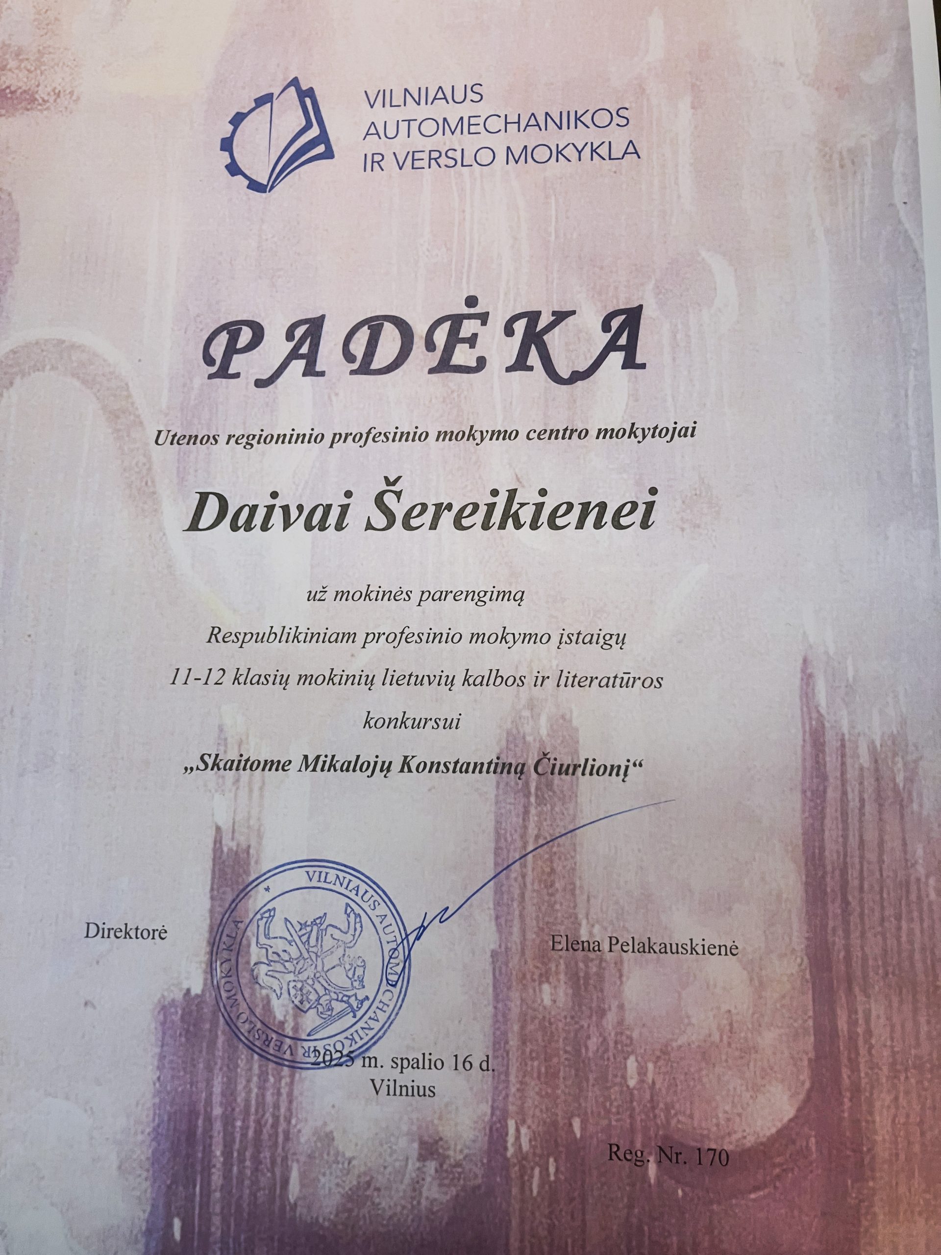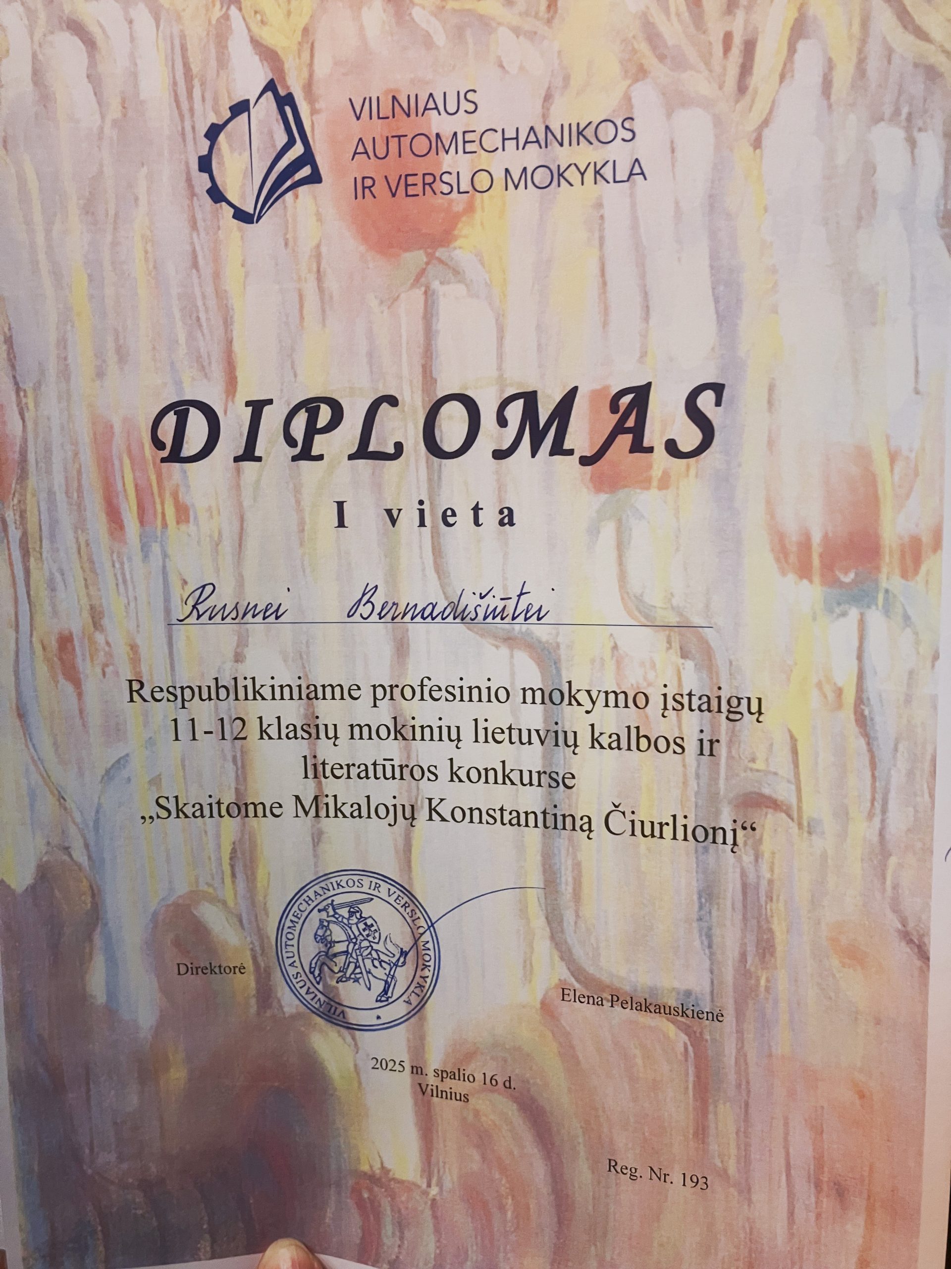 2025 m. spalio 16 d. Vilniaus automechanikos ir verslo mokykloje, minint 150-ąsias Mikalojaus Konstantino Čiurlionio gimimo metines, vyko respublikinis profesinio mokymo įstaigų 11–12 kl. mokinių lietuvių kalbos ir literatūros konkursas „Skaitome M. K. Čiurlionį“. Keturiolika dalyvių iš dešimties mokyklų prisilietė prie šviesos, kurią paliko menininkas, – skaitė jautrius, kupinus kūrybos ir vidinių išgyvenimų jo laiškus žmonai Sofijai. Didžiulė sėkmė lydėjo Utenos RPM centro Mr-24 gr. mokinę Rusnę Bernadišiūtę, užėmusią pirmąją vietą! Skaitovė ypatingu balsu pavergė tiek žiūrovus, tiek komisiją, tiek palaikymo komandą! Jos teigimu, tai ne tik įvertinimas, bet ir įkvėpimas toliau puoselėti kultūrinį paveldą, domėtis menininko kūryba ir skleisti jo žodžio grožį, todėl patirtos emocijos – jaudulys, džiaugsmas, pasididžiavimas – atmintyje liks ilgam. Utenos RPM centro bendruomenė sveikina nugalėtoją ir ją rengusią mokytoją Daivą Šereikienę, nuo pasiruošimo pradžios tikėjusią merginos pergale! Lai šis laimėjimas skleidžia čiurlionišką šviesą…