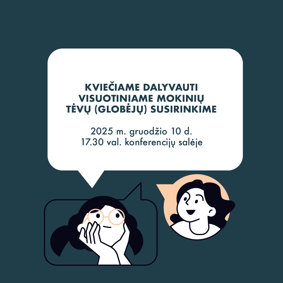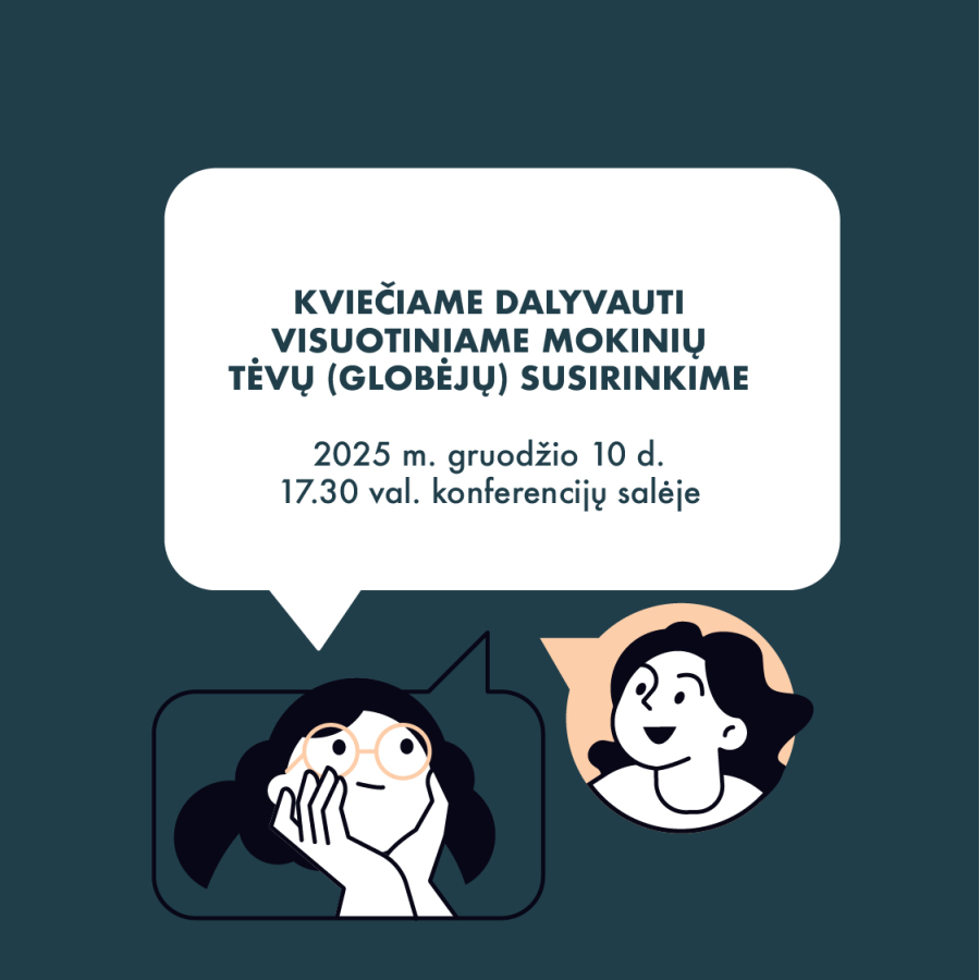 2025 m. gruodžio 10 d. 17.30 val. konferencijų salėje vyks visuotinis mokinių tėvų (globėjų) susirinkimas.
