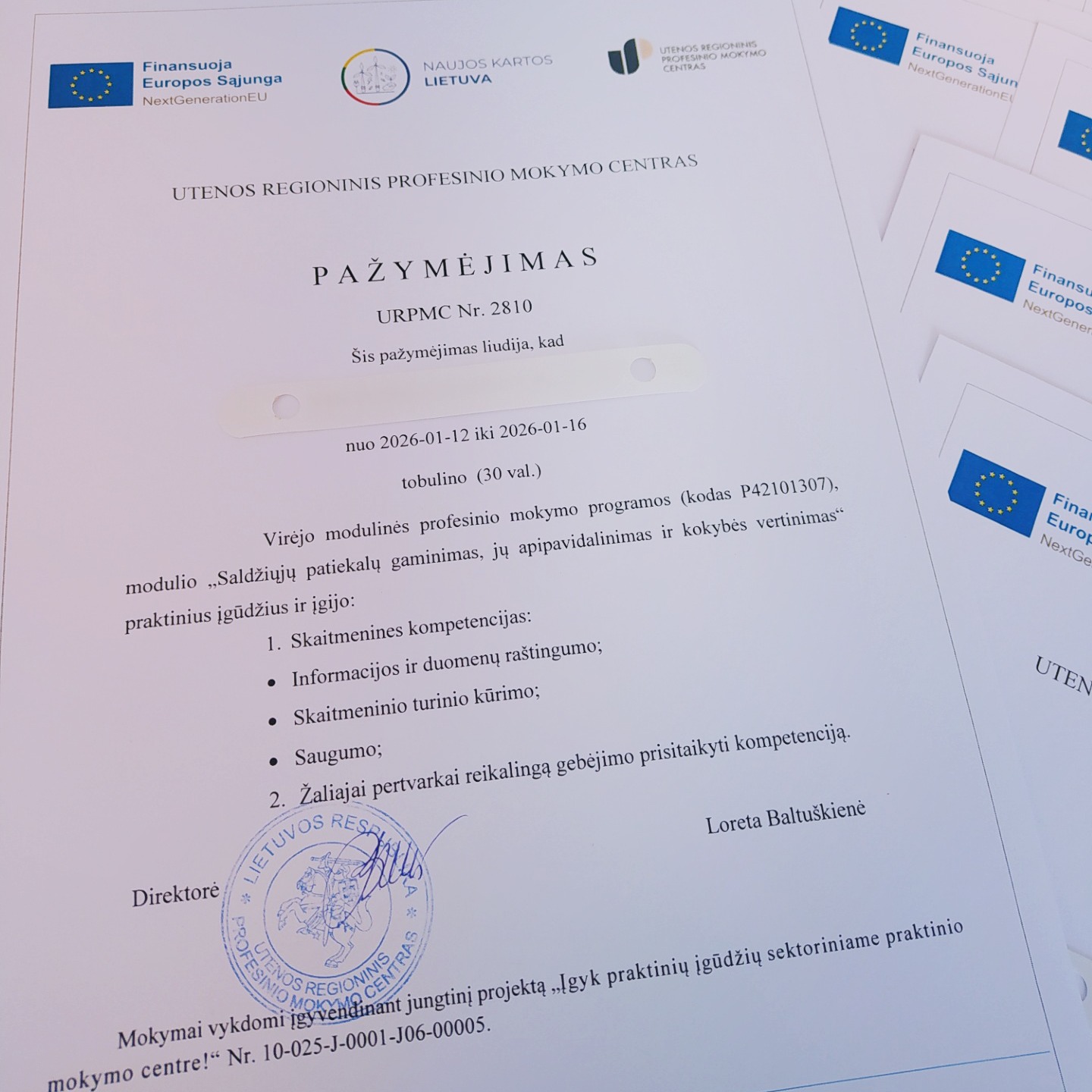 2026 m. sausio 12-16 d. pagal projektą „Įgyk praktinių įgūdžių sektoriniame praktinio mokymo centre!“ (projekto Nr. 10-025-J-0001-J06-00005) Maisto pramonės sektoriniame praktinio mokymo centre praktinius įgūdžius tobulino Ukmergės technologijų ir verslo mokyklos Virėjo profesinio mokymo programos mokiniai. 30 val. trukmės mokymai vyko pagal modulio "Saldžiųjų patiekalų gaminimas, jų apipavidalinimas ir kokybės vertinimas" programą.