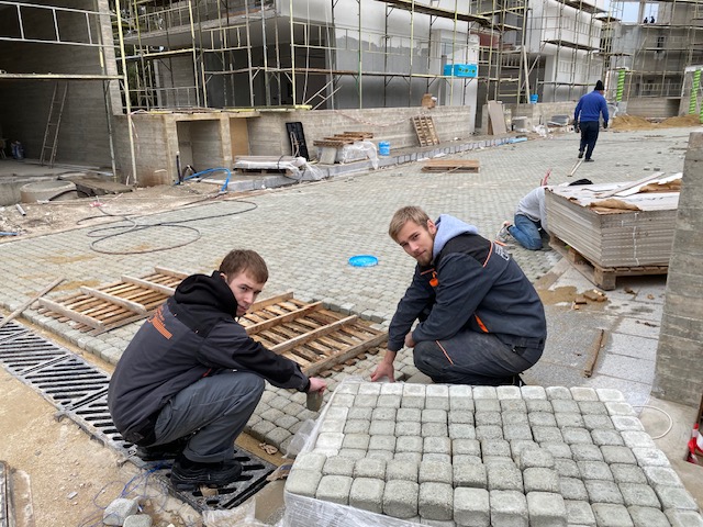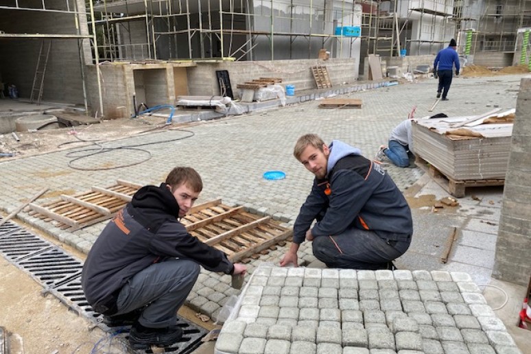 Apdailininko specialybės AP-25 grupės mokiniai Gabrielius Nasevičius, Augustinas Pelakauskas, Jonas Stiopin, Viktorija Malakauskaitė ir Živilė Kviklytė praktiką atlieka statybų įmonėje „Multibuild LTD“ (Paphos).